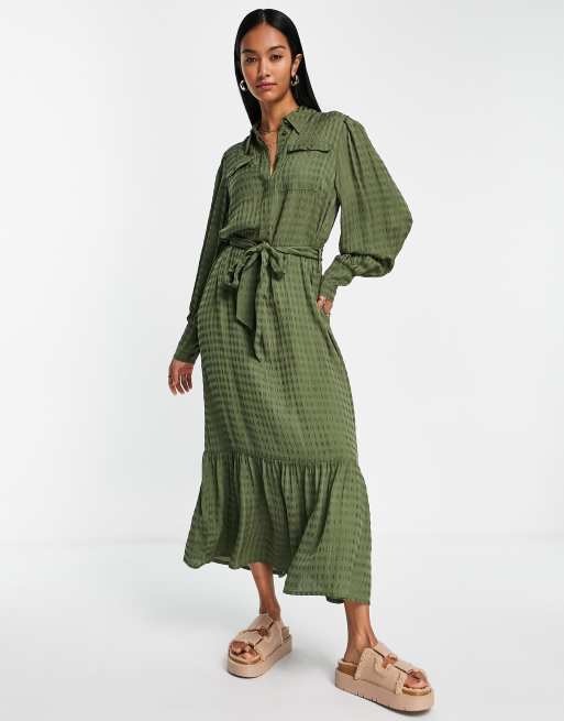 River Island – Khakifärgad strukturerad skjortklänning i midilängd med skärp