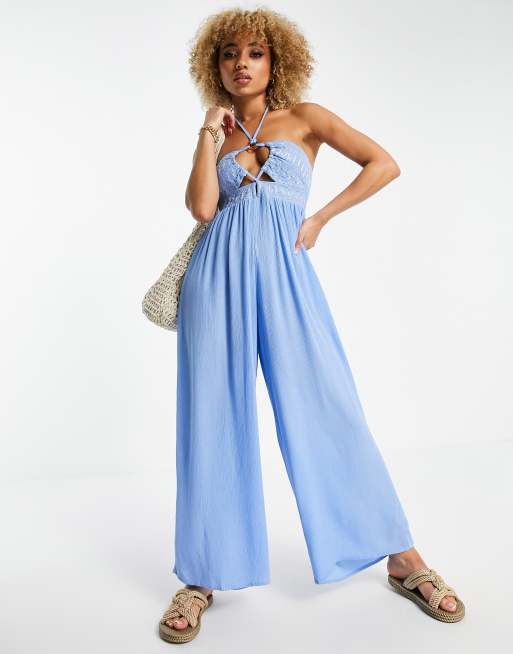 River Island – Ljusblå strand-jumpsuit med halterneck och vida ben