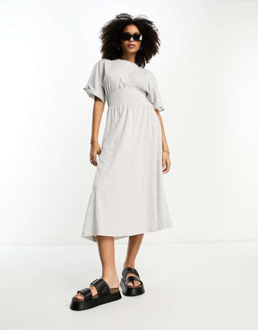 River Island – Ljusgrå smockad midiklänning av jersey med indragen midja