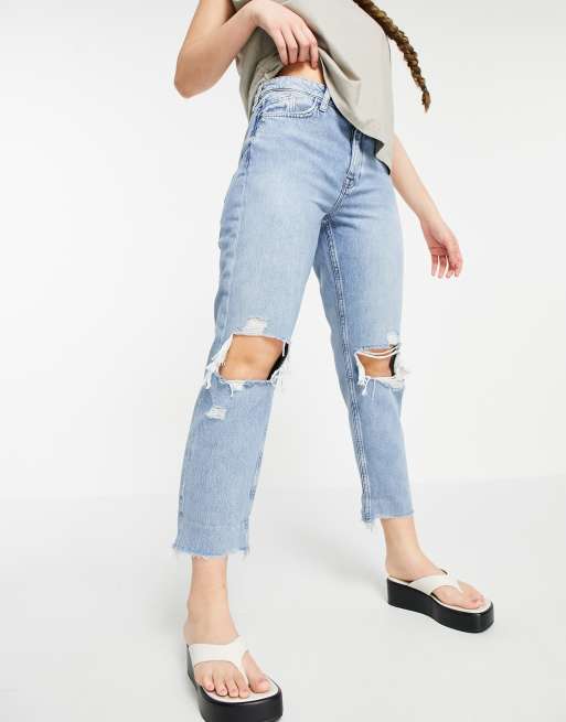 River Island – Mellanblå boyfriendjeans med slitna knän