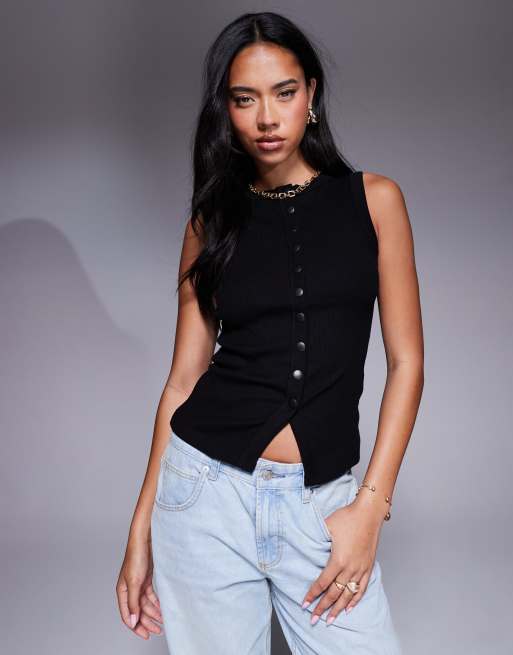 River Island – Svart, ribbat linne med knäppning