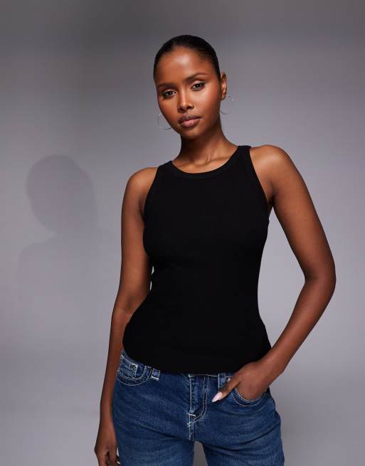 River Island – Svart ribbat linne med smala axelband