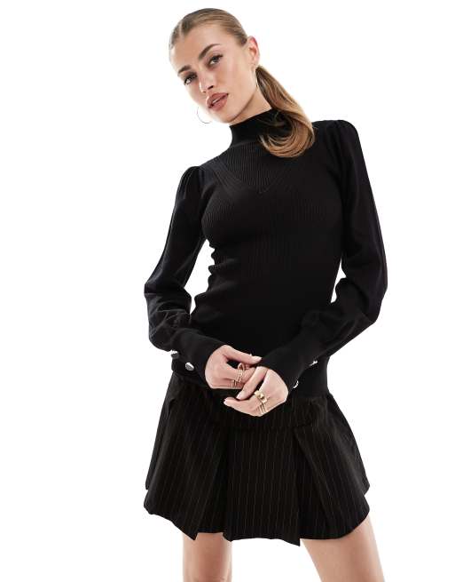 River Island – Svart, stickad topp med puffärmar och knappar