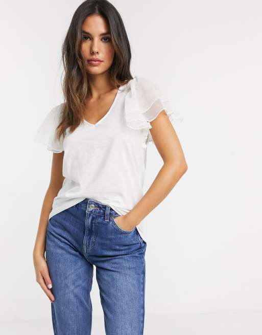 River Island – Vit kortärmad t-shirt med v-ringning och frans