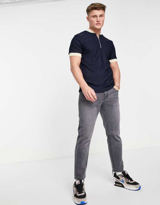 River Island – Vit stickad pikétröja med marinblå kantrand