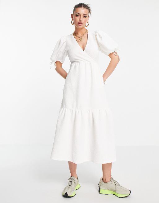 River Island – Vit strukturerad midiklänning med omlottdesign
