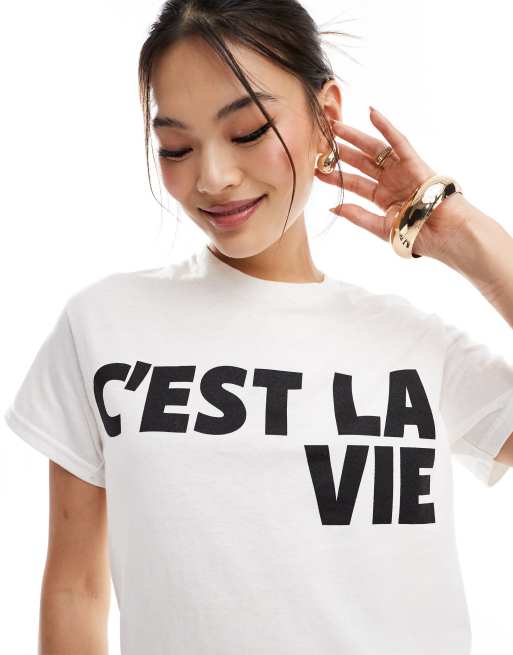 River Island – Vit t-shirt med 'c’est la vie'-tryck