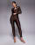 Ruched & Ready – Chokladbrunt, glansigt set med leggings och långärmad, skulpterande body med urtagbara axelvaddar och utskurna detaljer