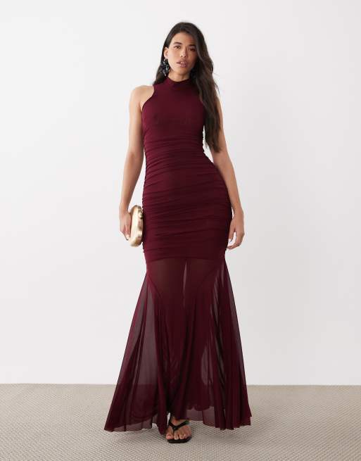 Ruched & Ready – Vinröd, skulpterande, ärmlös maxiklänning i mesh med hög krage och skir fishtail