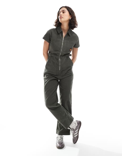 Santa Cruz – Kakifärgad jumpsuit i regular fit och manchestertyg med kort ärm och dragkedja