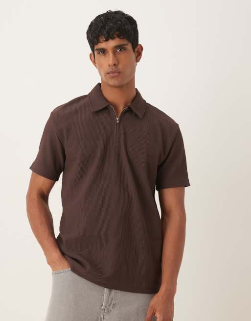 Selected – Brun, plisserad pikétröja med kort dragkedja
