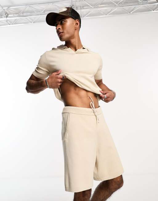 Selected Homme – Beige stickade shorts med dragsko, del av set