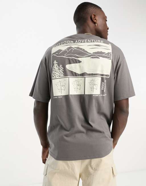 Selected Homme – Grå t-shirt i oversize med bergsmotiv på ryggen