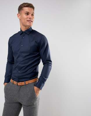 Selected Homme – Mörkblå, lättstruken finskjorta med smal passform