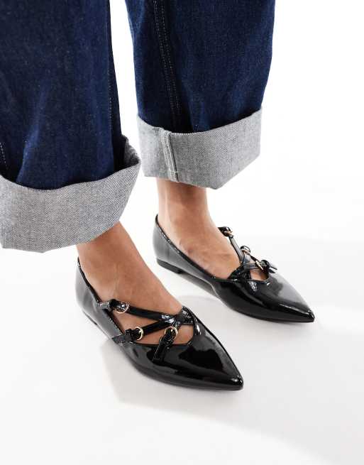 SEQWL – Svarta, lackade platta ballerinaskor med spetsig tå och remmar