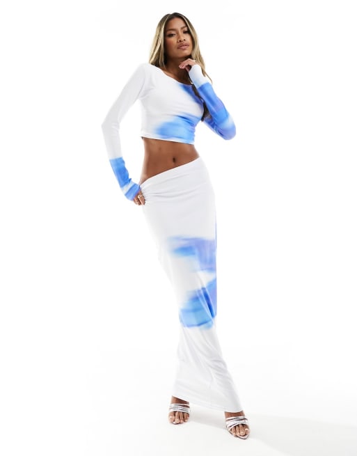 Simmi – Vit och blått set med utplacerat tryck med crop top med långa ärmar och kjol