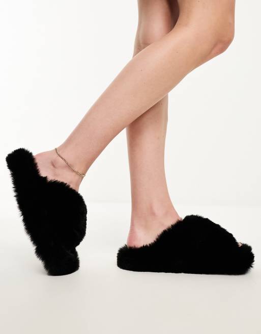 Simmi London – Fuzzy – Svarta tofflor med korsade band