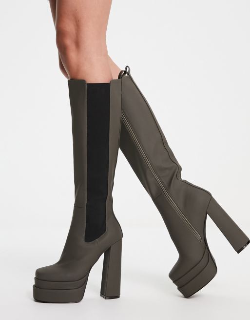 Simmi London – Martha – Olivgröna knähöga klackstövlar med platåsula