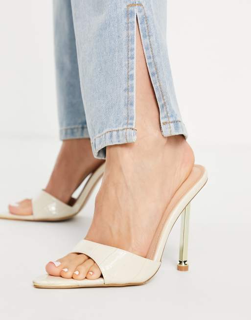 Simmi London – Torez – Elfenbensvita spetsiga mules i krokodilskinnsimitation med guldklack