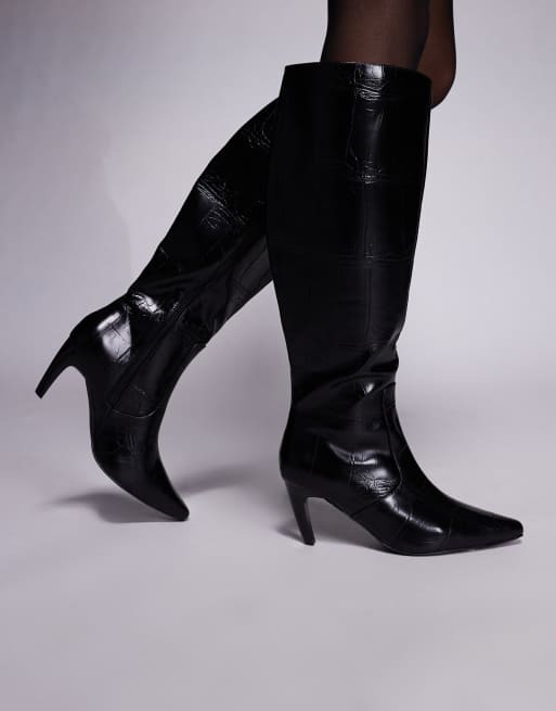Simmi Wide Fit – Lapis – Svarta, krokodilskinnsmönstrade, knähöga boots med klackar och bred passform