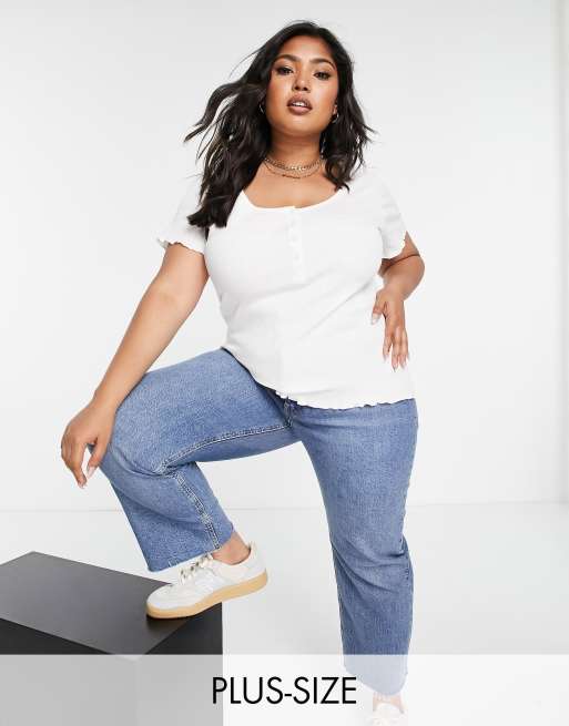 Simply Be – Vit ribbad t-shirt med kort ärm och tryckknappar