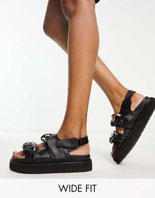 Simply Be Wide Fit – Svarta platta sandaler i farfarsstil med grov kedja