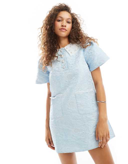 Sister Jane – Ljusblå miniklänning i jacquard och blommig spets med krage
