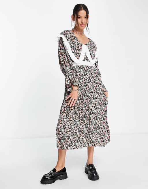 Sister Jane – Mörk blommig midiklänning med en oversized krage