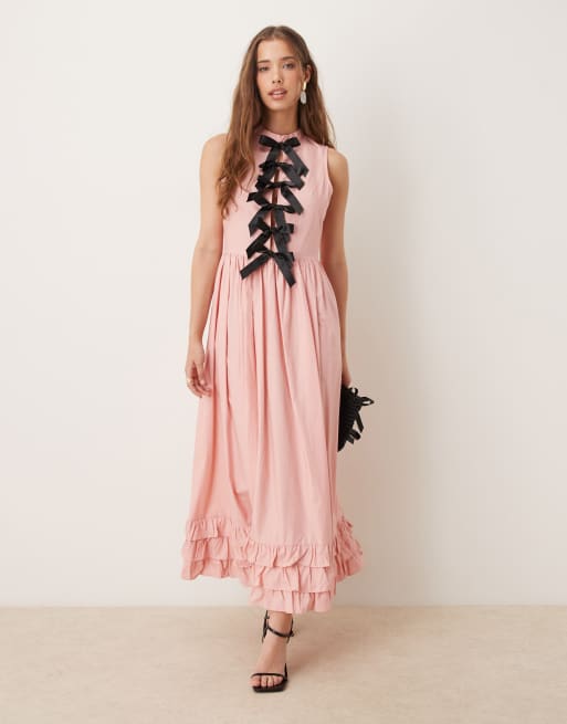 Sister Jane – Rosa midaxiklänning med kontrasterande rosett och volang på axelbanden