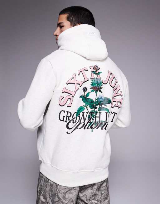 Sixth June – Grå huvtröja med växttryck och logga baktill