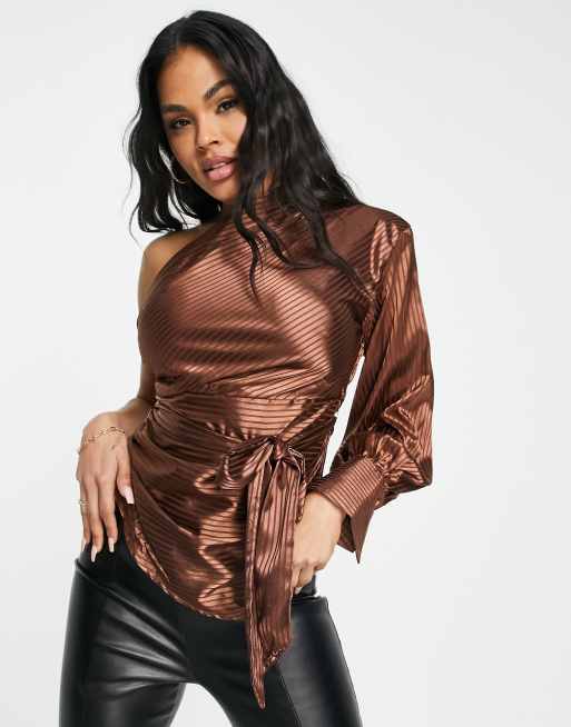 Skylar Rose – Brun ryschad blus i one shoulder-design