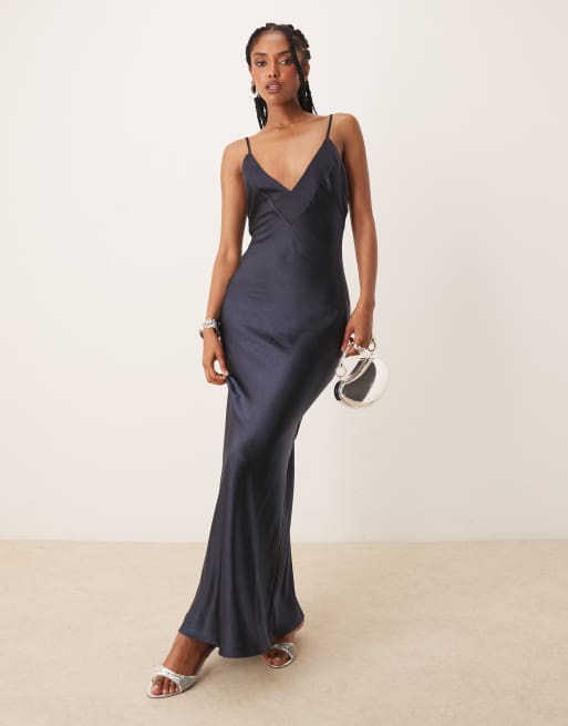 SNDYS – Marinblå maxiklänning i satin med v-ringning och knytband baktill, exklusivt hos ASOS