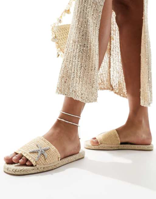 South Beach – Beiga, utsmyckade espadrillos i rafiabast med öppen häl och sjöstjärna