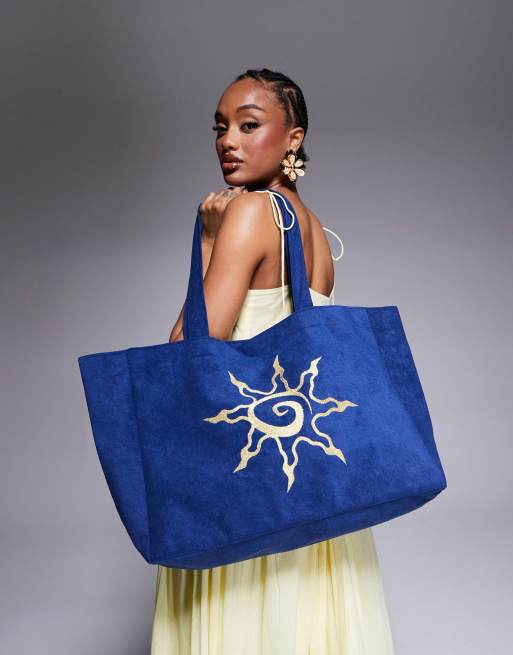 South Beach – Mörkt marinblå toteväska i frotté för stranden med solmotiv