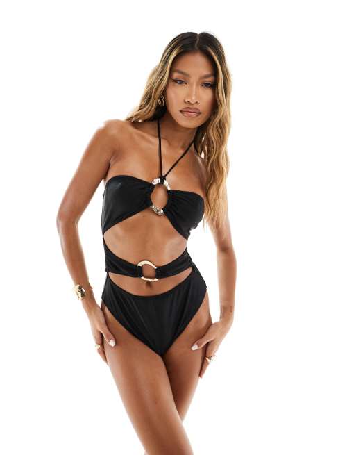 South Beach – Svart baddräkt med halterneck och utskurna detaljer och guldfärgat spänne framtill