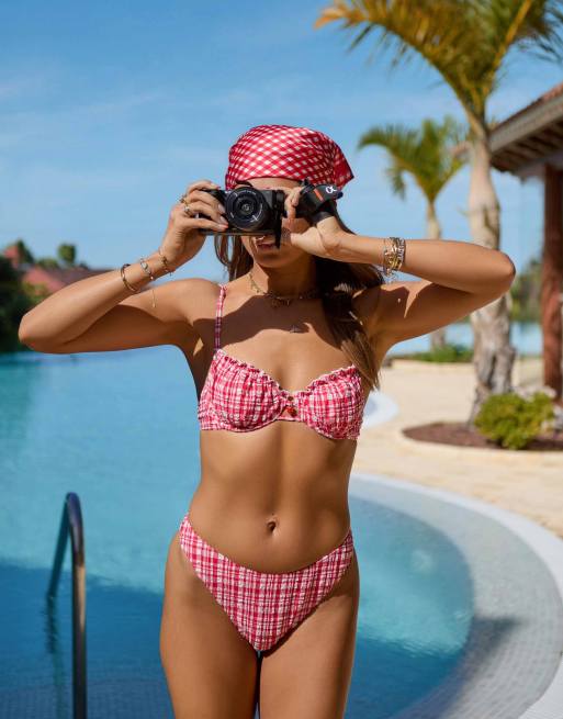 South Beach x Misha Grimes – Röd, ginghamrutig bikiniunderdel med hög benskärning