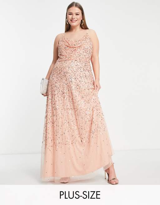 Starlet Plus – Exclusive – Persikorosa, paljettklädd maxiklänning med draperad ringning