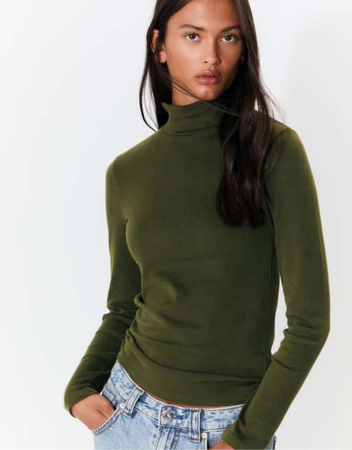 Stradivarius – Basic – Grön t-shirt med hög halsringning