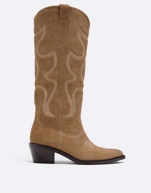 Stradivarius – Beige cowboyboots i läder med klack