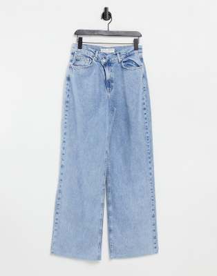 Stradivarius – Blå, urtvättade dad jeans med asymmetrisk midja