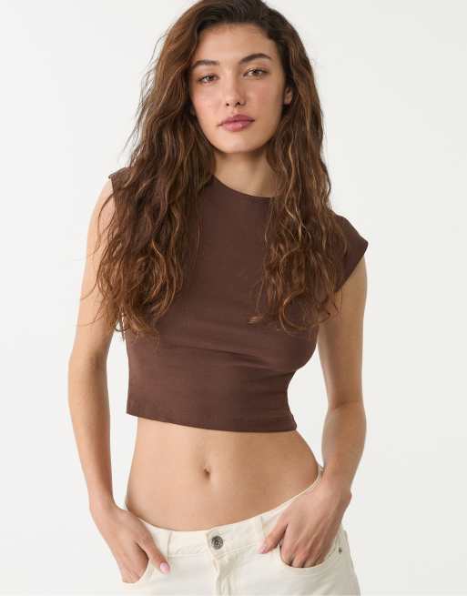 Stradivarius – Brun, figurnära, kort t-shirt