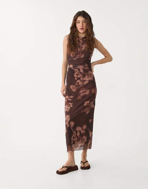 Stradivarius – Brun, mönstrad midiklänning i tyll