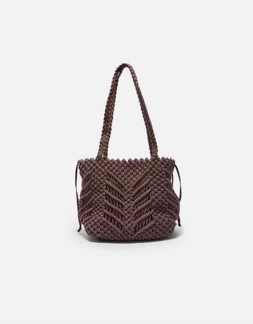 Stradivarius – Brun, virkad shoppingväska med metallisk tråd