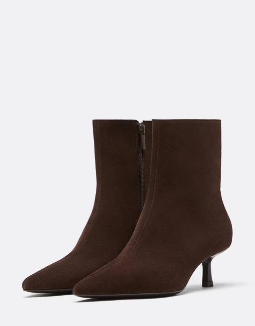 Stradivarius – Bruna ankelboots i delat läder med stilettklackar