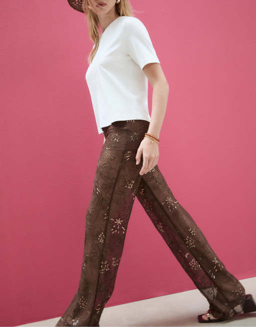 Stradivarius – Bruna, lediga byxor med paljetter och broderi