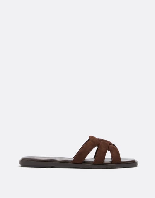 Stradivarius – Bruna, platta sandaler i mockaimitation