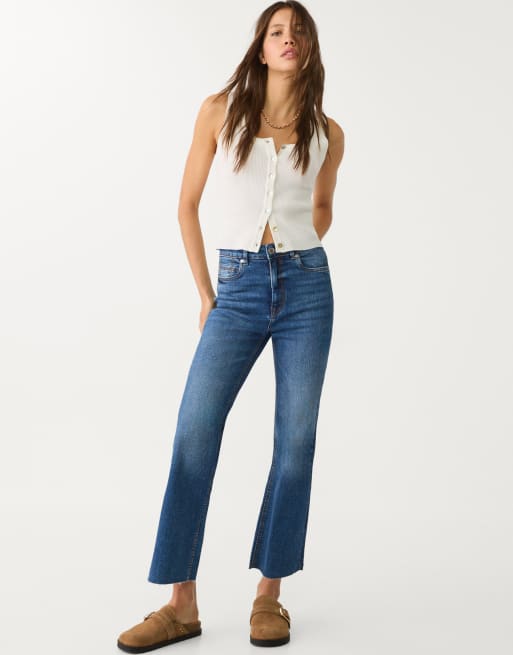 Stradivarius – D78 – Mellanblå, ankellånga jeans med utsvängd design