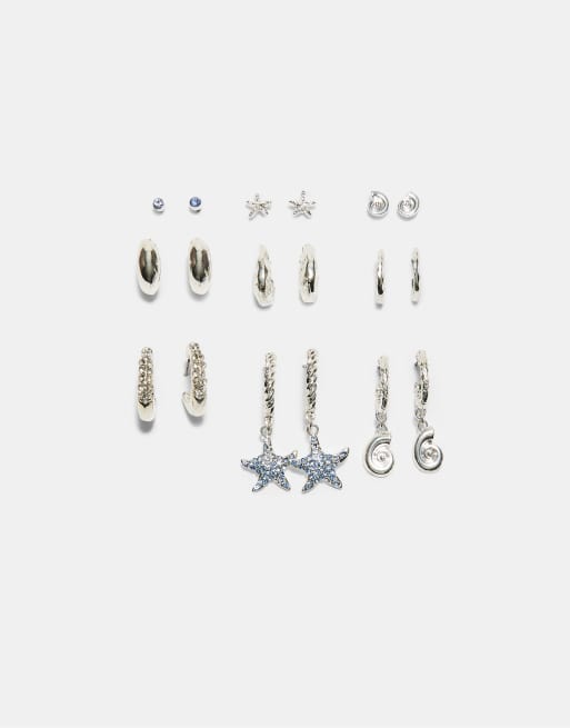 Stradivarius – Grå örhängen med strass och sjöstjärna, 9-pack