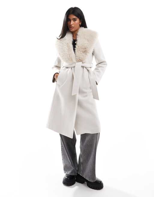 Stradivarius – Gräddvit, lång kappa med fuskpälskrage
