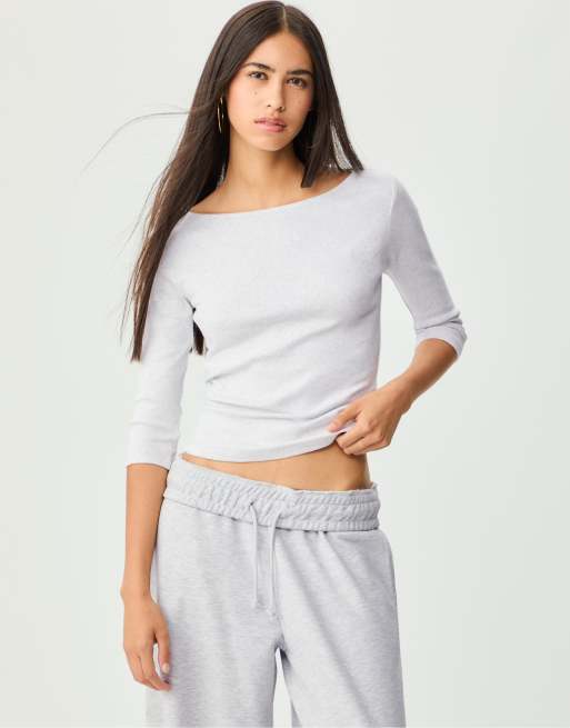 Stradivarius – Gråmelerad, enkel t-shirt med båtringning